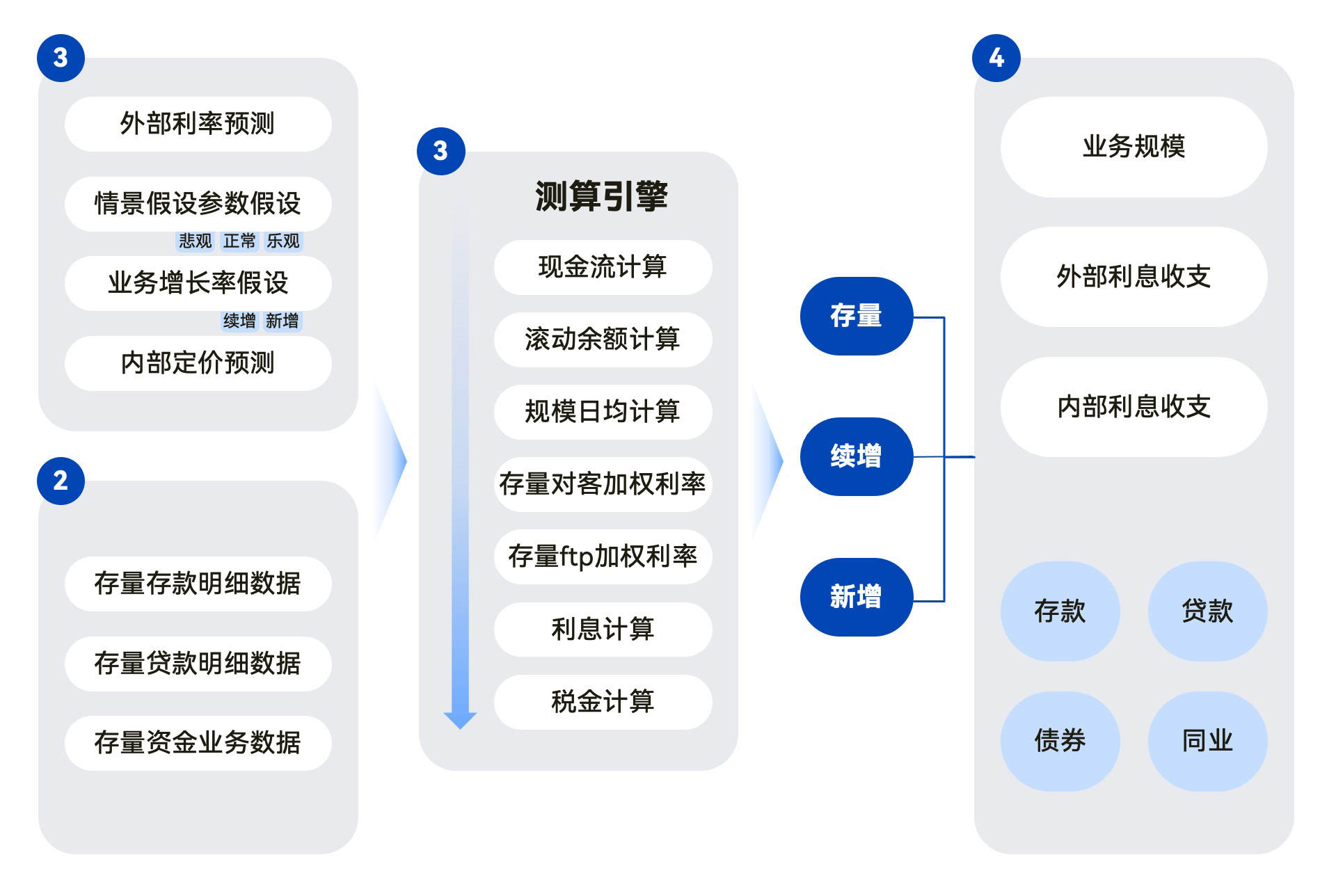 根据外部经济、市场指标、同业信息,结合银行发展战略,对该农商行的各业务条线进行情景假设模拟,包括预测存贷款对客利率、FTP利率、业务发展结构、业务发展额度等多种未来的业务场景,从而对业务盈利情况模拟预测。
