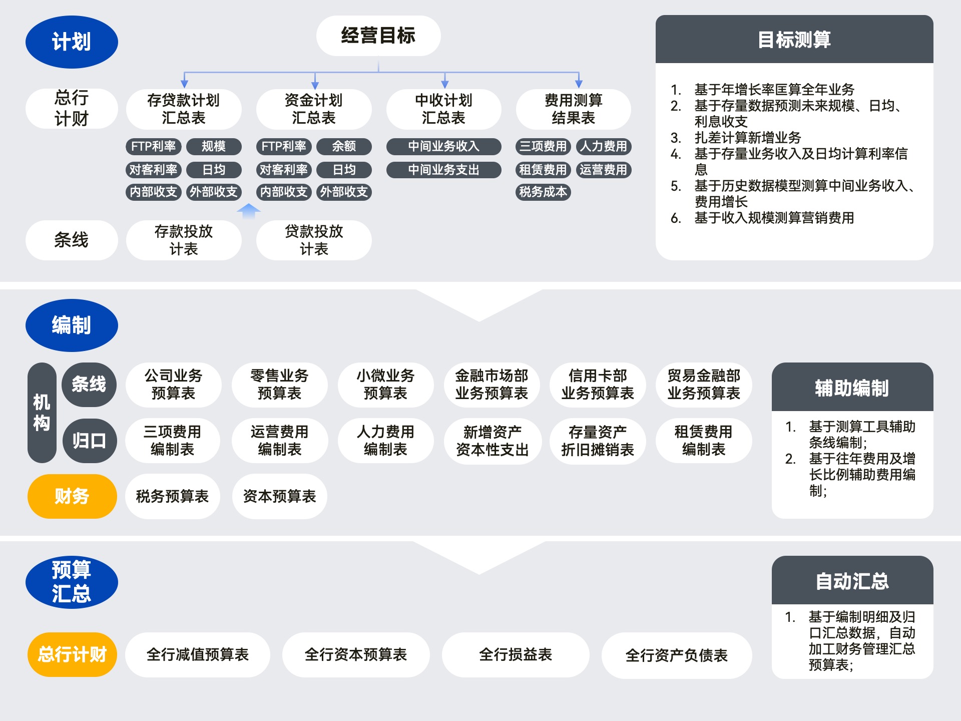 年度预算编制整体涵盖总行预算、分支行预算、村镇银行预算的业务、费用、财务、资本性支出预算,采用自上而下、上下结合的编制方式。