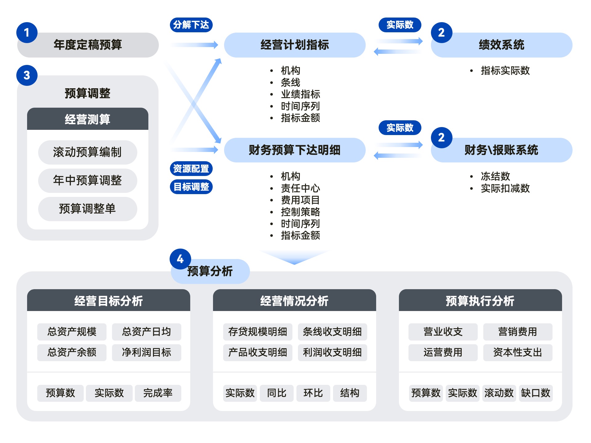 该头部农商行,在落地了传统银行数据库国产化核心系统后,趁热打铁用一年的时间、运用分步迭代的方式进行了全面预算系统的升级改造。围绕“工具+应用”的目标,实现了完整的全面预算管理、健全清晰的预算组织管理、价值导向的关键指标体系、规范标准的预算编制模型、共享高效的信息管理系统等模块的建设。