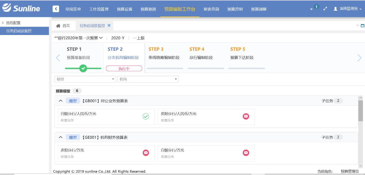 预算工作台涉及工作流、任务流、审批流、待编制和审批任务、预算预警等功能,此模块可解决该农商行任务混乱的管理痛点,实现上下级业务的高效连接,明确各级责任。其中,预算预警像是一个监督工具,对迟报、漏报工作任务定时发送预警,有效监督工作进展,全方位提升整体工作效率。
