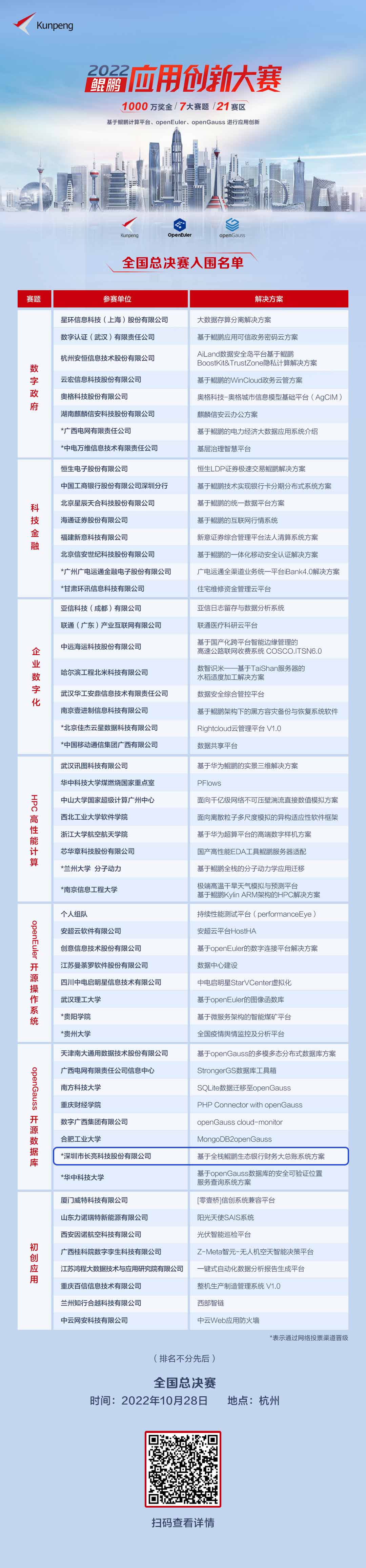 参赛方案亮点 技术架构特点:长亮科技大总账基于微服务(微服务+分布式计算)架构,结合分布式技术到达高内聚、低耦合、高可用、高并发、高性能、灵活扩展的效果,适配大量信创国产化产品。 分布式数据库:长亮科技大总账采用分布式调度+分布式数据库(OpenGauss)等机制进行日间、日终批量业务处理,提升系统性能、避免单点故障,通过扩展应用、数据库节点保证系统性能,结合同城双中心、两地三中心高可用部署模式,满足业务量跨跃式增长的要求。 目前该方案已经通过了兼容性认证、可靠性验证、安全合规检查,并且双方联合进行大总账产品容器化部署验证,以及产品配置功能、业务场景案例验证并通过性能测试,取得鲲鹏技术认证书。 (获奖名单) 2022鲲鹏应用创新大赛全国总决赛,我们在杭州,不见不散!