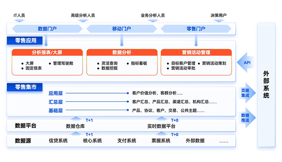 长亮科技紧抓国内银行零售数字化转型的需求,将数字化技术与零售业务流程深度耦合,为银行提供涵盖零售数据采集、数据整合、数据加工、数据服务、数据应用支撑为一体的数字化零售经营分析解决方案,该方案以打造银行零售类应用及服务的基础数据平台为目标,旨在强化零售业务数据治理,有效沉淀零售数据资产,为零售业务的营销、风控、经营决策等全链条环节提供数据服务,以提升零售获客洞察与价值挖潜能力,助力零售业务数字化转型。