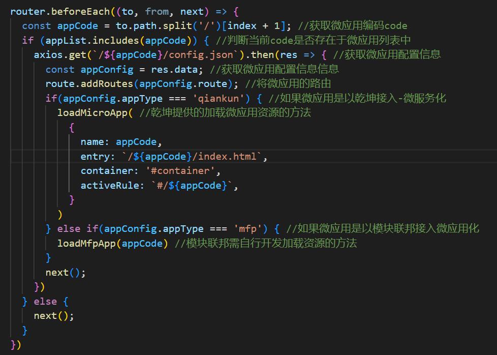 这里需要注意的是,考虑到微应用的动态加载,加载器加载的微应用个数不做限制,如一次性将所有的微应用路由全部加载,势必会造成路由数据过于庞大,因此初始化时只注册中心路由,微应用对应的页面路由,则在第一次进入当前微应用的时候创建。此步骤放在loader加载器中实现。