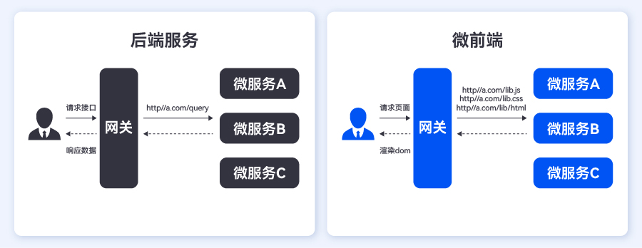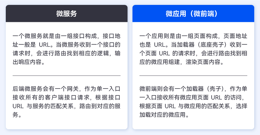 通过跟微服务进行对比,我们可以更清晰地理解微前端的概念: