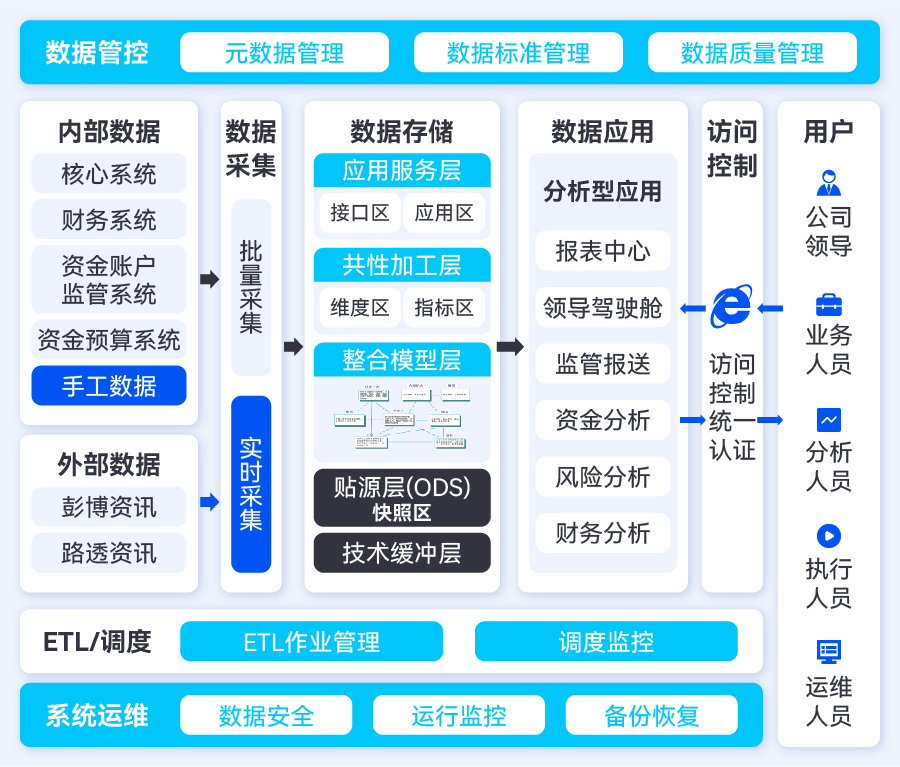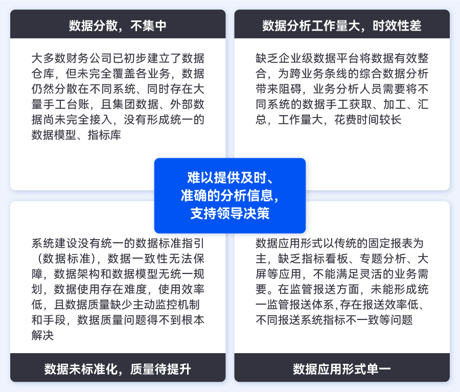 为了深挖数据价值、有效反哺业务,建立企业级大数据平台,用以全面采集数据、标准化数据模型、统一指标体系、拓展数据应用场景,成为财务公司数字化转型的必然选择。