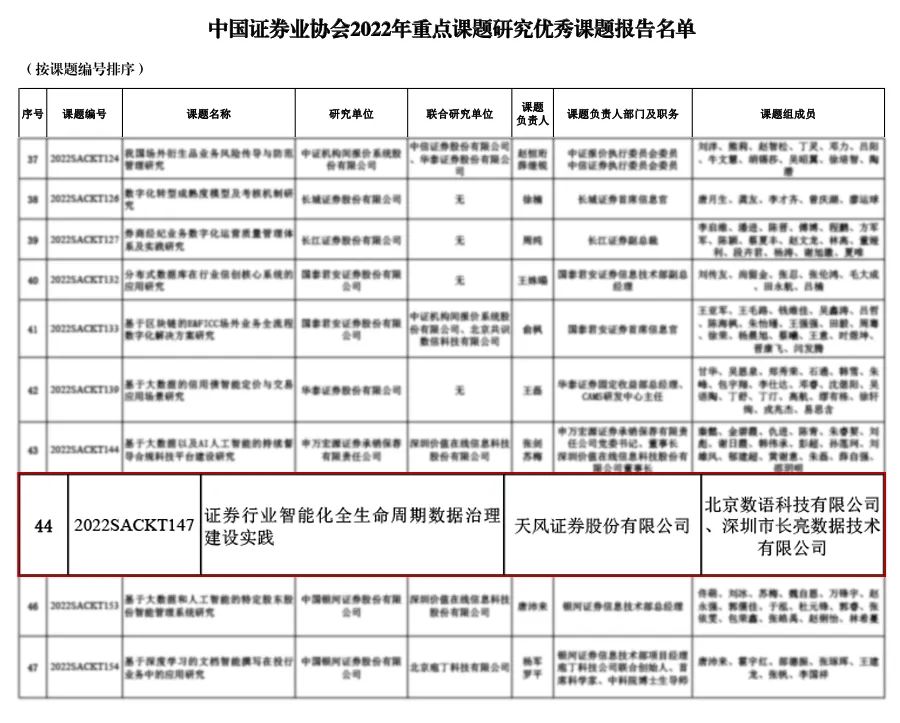 长亮科技与天风证券等公司联合报送的《证券行业智能化全生命周期数据治理建设实践课题研究》,成功入选中国证券业协会2022年重点课题研究优秀课题报告名单,也是数据治理领域唯一入选的课题。