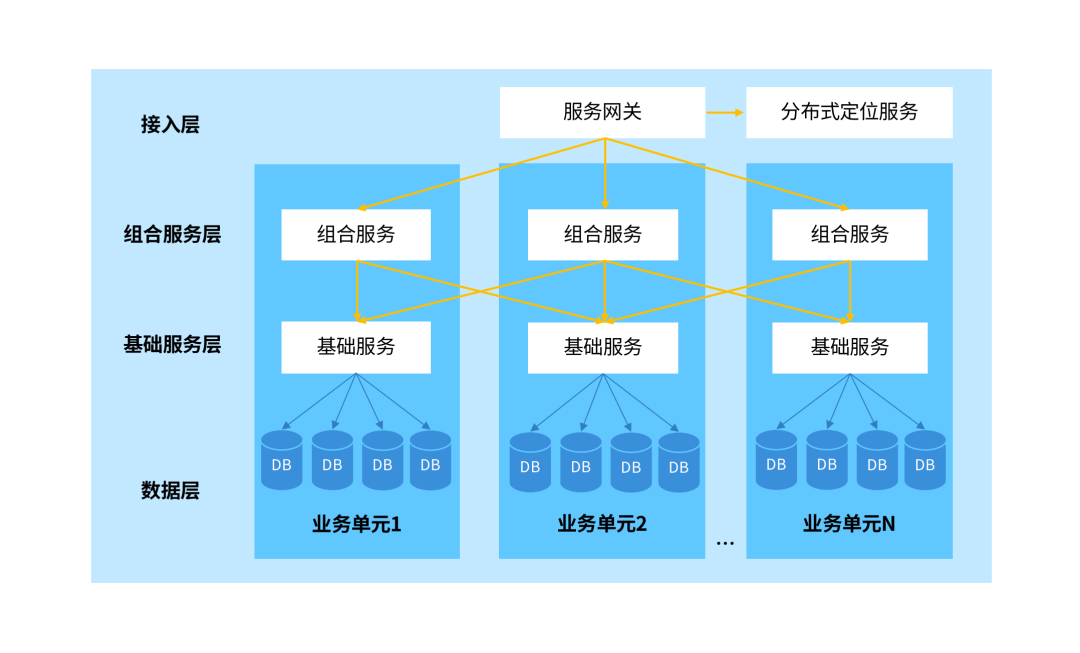 在介绍分布式定位服务之前,我们先介绍下单元化架构的概念,单元是指一个能完成某一类业务操作(如个人存款业务)的自包含集合,在这个集合中包含了业务所需的服务,以及分配给这个单元的客户数据。单元作为部署的基本单位,通常会在在多个机房中容灾部署,每个机房内单元数目不固定,任一单元均部署系统所需的全部应用,数据则是全量数据按照某种维度划分后的一部分。