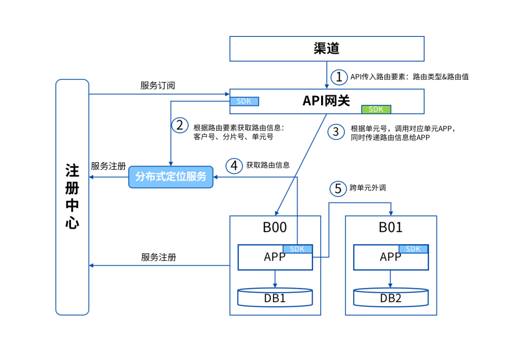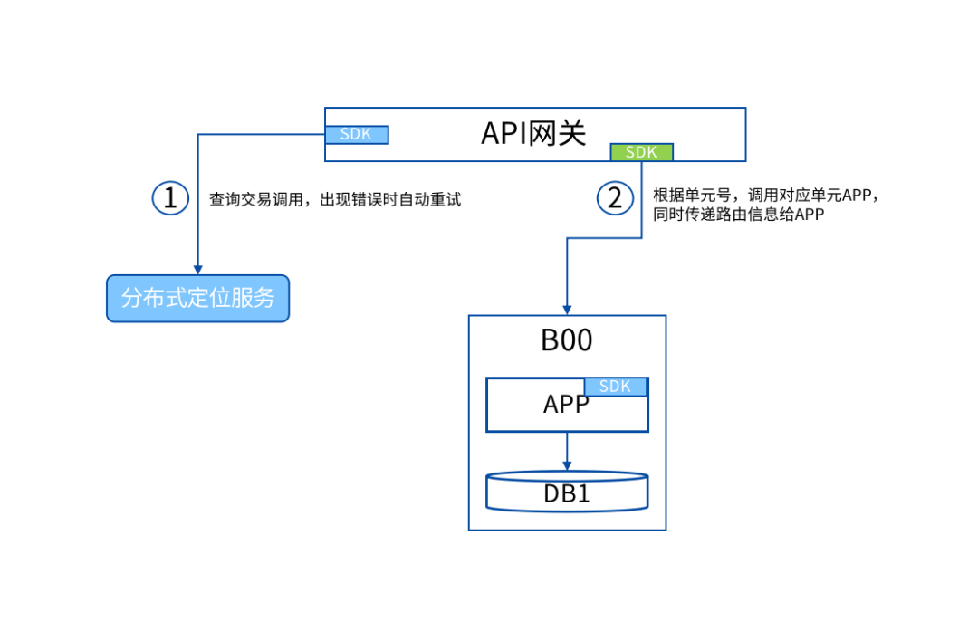 在普通场景下,网关收到交易后从分布式定位服务中查询到该笔交易所属的单元,然后再由服务调用组件将交易转发到具体的单元上。