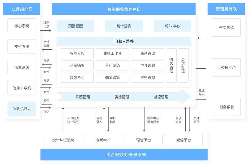 提供统一催收平台,支持智能洗号、电催、法催、短信、语音、还款及转派等功能,支持资产公司、律所、催收公司信息共享,支 持催收策略灵活切换,最大限度提高回款效率