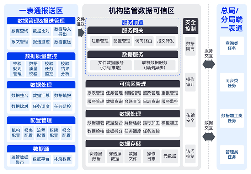 屏蔽底层技术细节:通过服务前置提供标准的服务接口,打通监管端和机构监管可信区,从而屏蔽机构端的底层存储和技术差异,实现服务交互和数据交互。