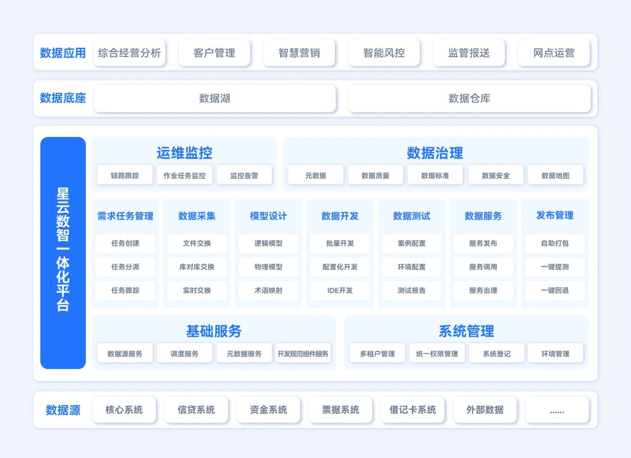 针对上述这些痛点,长亮科技为数据类项目实施团队着手打造了“星云数智一体化平台”。作为面向数据运营的一体化平台,其设计方向主要是满足数据仓库和数据湖的数据加工需求,为应用系统提供加工好的数据。并结合DataOps数据运营方法论,实现数据资产的加工、建模和对外服务供给。对数据开发而言,星云平台可以有效降低管理成本,促进规范统一和落地,提高开发效率和质量。