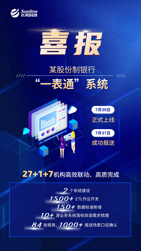 7月31日,某股份制银行与长亮科技共建的“一表通”系统正式上线,并顺利完成2.0版月报数据(6月)和2.0版日报数据(7月23日-27日)的报送工作。