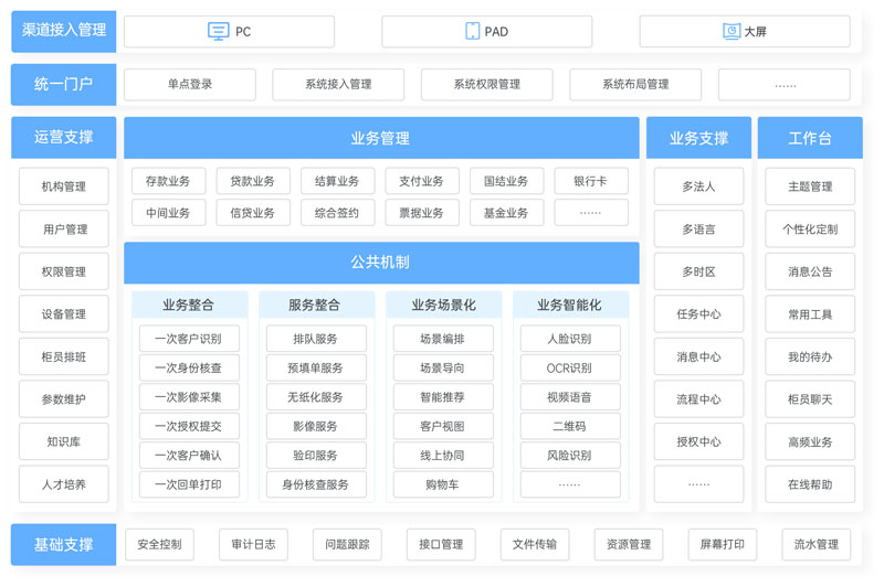 结合C/S和B/S两种架构的优点,实现银行前端特色需求与互联网高体验跨平台展现的完美结合,开创了全新的银行柜面设计模式