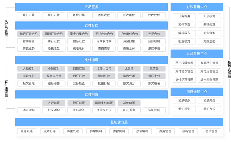 基于智能化支付领域模型进行构建,对建模成果进行功能分析和定义,设计分解并承接建模成果,达到智能编码目标,使支付领域的交付转向标准化、结构化、可视化,装配国内外汇款产品,采用交易和对账分离,提供新老系统并行的无风险切换方案,具备智能路由、智能入账、智能记忆、智能分析、智能组包、智能回复、智能回放等特点,为金融机构的支付提供业务研发运营一体化方案。长亮科技支付业务产品包含智能路由、行内转账、二代支付、超级网银、城银清、农信银、网联、银联、人民币跨境支付、数字人民币、SWIFT、RTGS、FPS、境内外币支付、支付宝、微信、境外各国家和地区等支付渠道,支持接入传统核心业务系统、互联网金融核心业务系统、电商平台、互联网收单业务,具备高度的安全运营体系设计,提供统一的支付业务管理、便捷的业务操作、业务流程的实现、支付行为管控、风险控制自动化处理等。