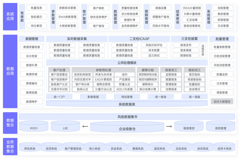 由第一支柱RWA计量系统、第二支柱ICAAP系统、第三支柱披露系统三大部分组成。其中,第一支柱RWA计量系统整合三大风险(信用风险、市场风险、操作风险)加权资产,实现风险加权资产和资本充足指标的准确计量,并实现资本充足率等监管指标的自动计算和管理;第二支柱ICAAP系统,构建完备的内部资本充足评估体系,将风险管理和资本管理紧密结合,满足监管合规;第三支柱披露系统,构建完整的第三支柱披露报表管理体系,实现披露报表的准确、合理、合规、追溯及审计要求。