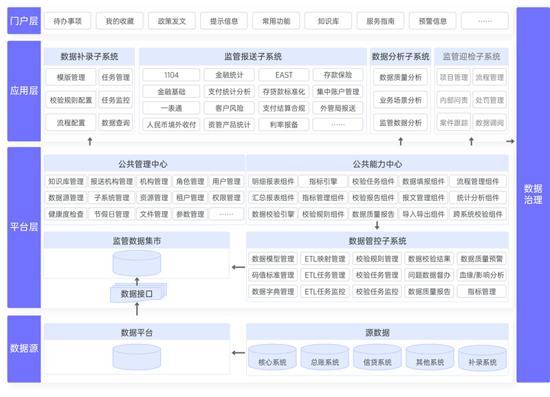 集成了全部主流监管机构要求报送的监管模块,可帮助银行及时、准确、完整、高效的做好数据报送工作,快速响应金融监管机构的要求,提供 “一站式”监管报送服务。报送模块覆盖非现场监管(1104)、金融统计大集中系统、一表通、银保监数据标准化规范(EAST5.0)、利率报备监测分析系统、存款保险信息系统、金融基础数据报送系统、支付信息统计分析系统(PISA)、存贷款标准化、支付结算合规、客户风险管理系统、集中银行账户管理系统、外管局报送系统等。