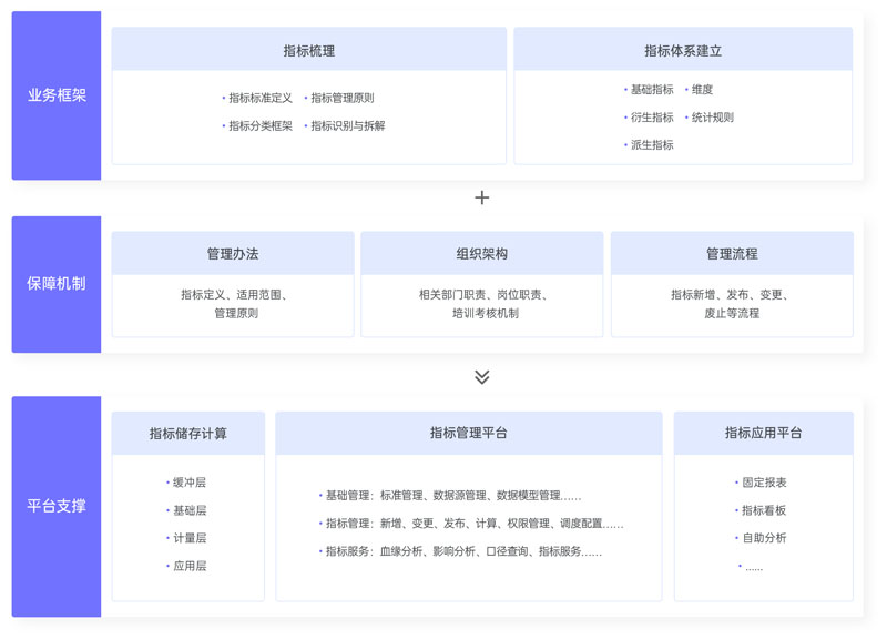 通过企业级指标统一管、算,实现指标全生命周期统一管理,包括三个方面:贴合企业现状及远景规划,制定指标管理机制;以业务场景为驱动,以存量指标体系梳理为基础,形成企业级统一的指标体系,并规划指标库数据模型落地实施;搭建指标管理平台,实现指标的统一定义、统一加工、统一管理、统一服务。
