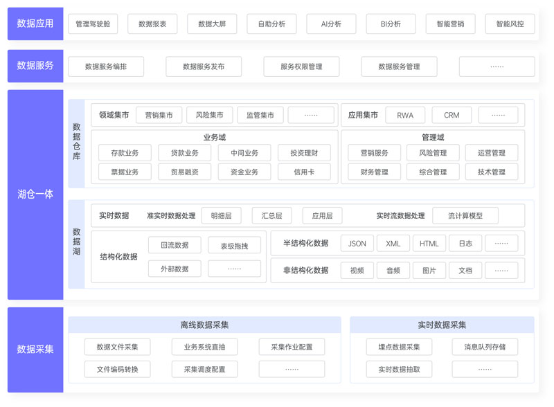 融合数据湖与数据仓库的优势,形成一体化的数据底层平台,通过湖仓一体技术,使得数据平台底层支持多数据类型统一存储,实现数据在数据湖、数据仓库之间无缝调度和管理,并实现统一数据服务以支撑数据应用及分析。