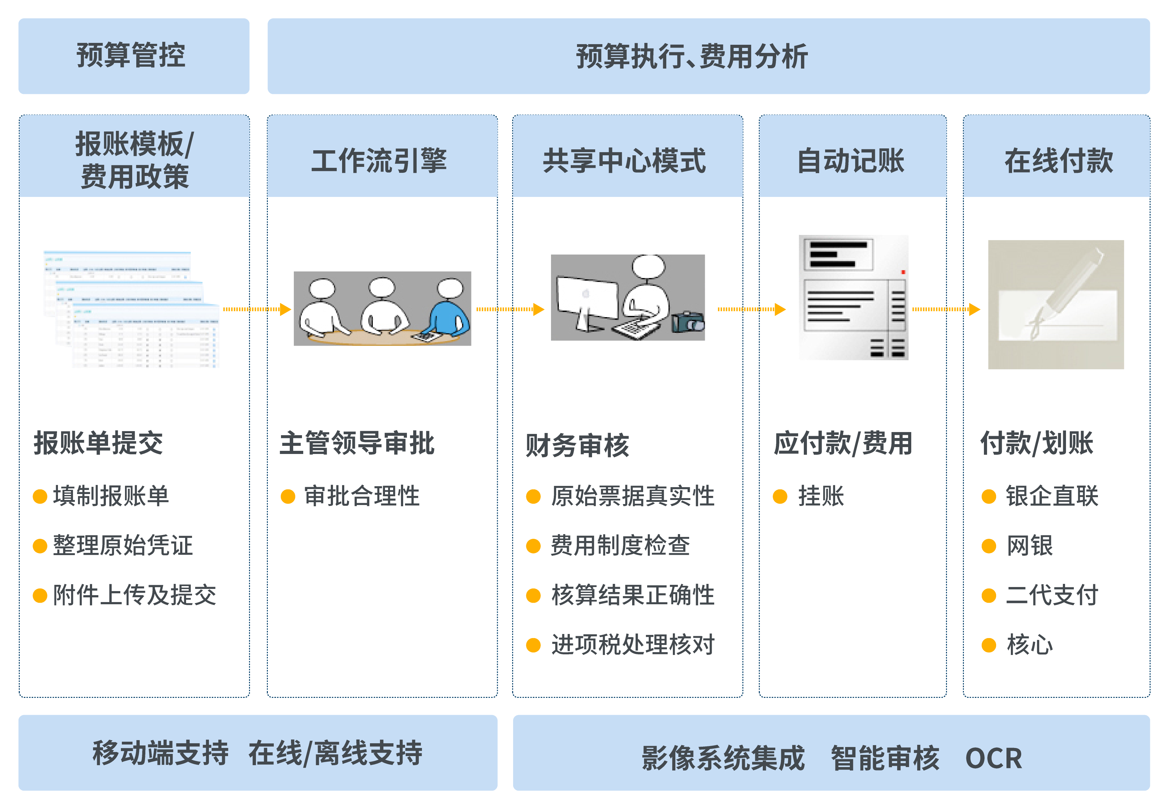 集成多渠道报账方式,支持移动办公,提升工作效率,改善用户体验;