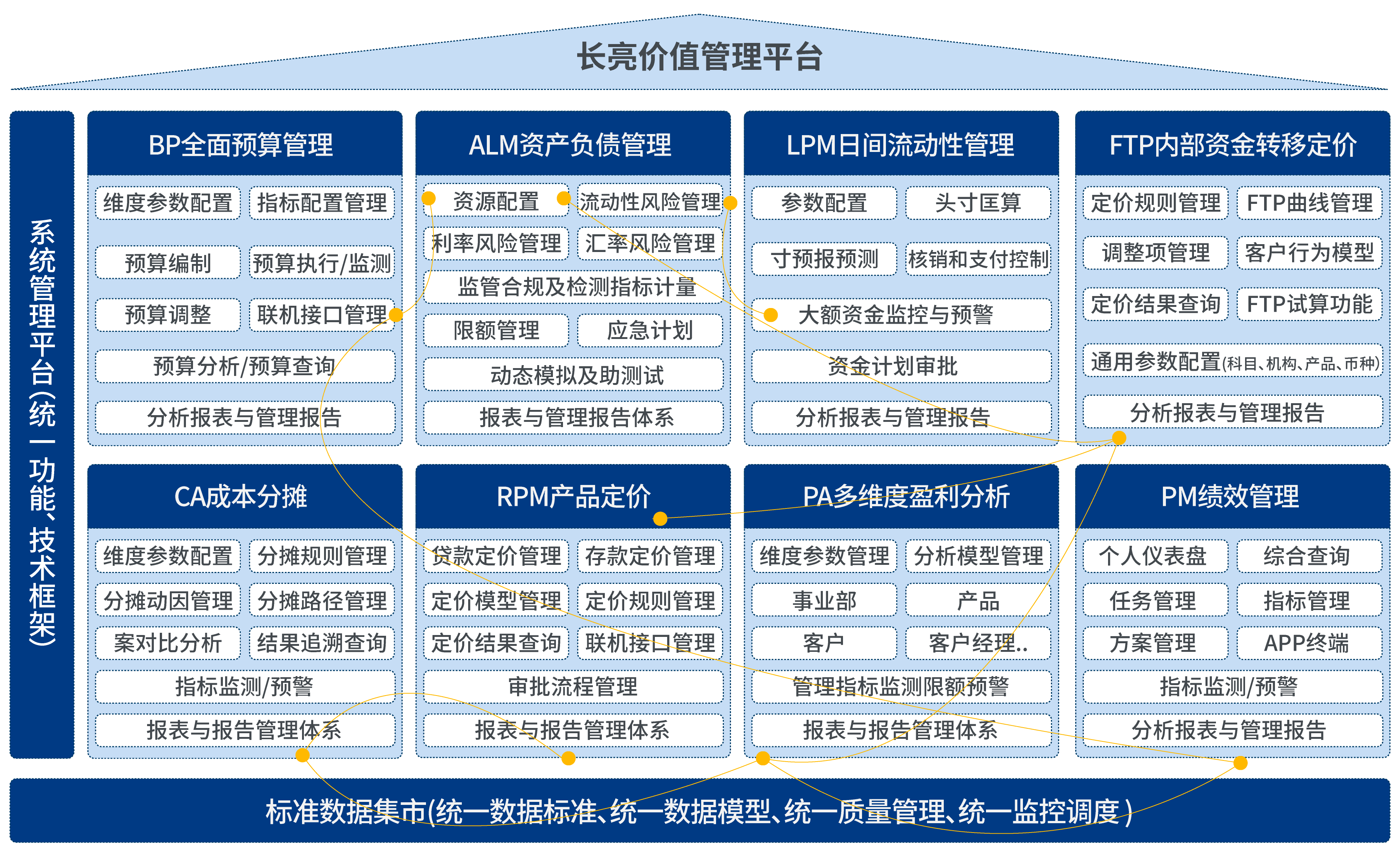 长亮科技全面价值管理解决方案将银行经营和管理作为一个系统性的整体,通过“标准数据整合、产品功能联通、管理应用协同、交互体验优化”的一体化产品设计,形成“战略-组织-流程-绩效”的管理协同,彻底解决银行面临的孤岛式管理信息系统的建设困局,持续帮助商业银行构建具备银行业特色的管理系统。