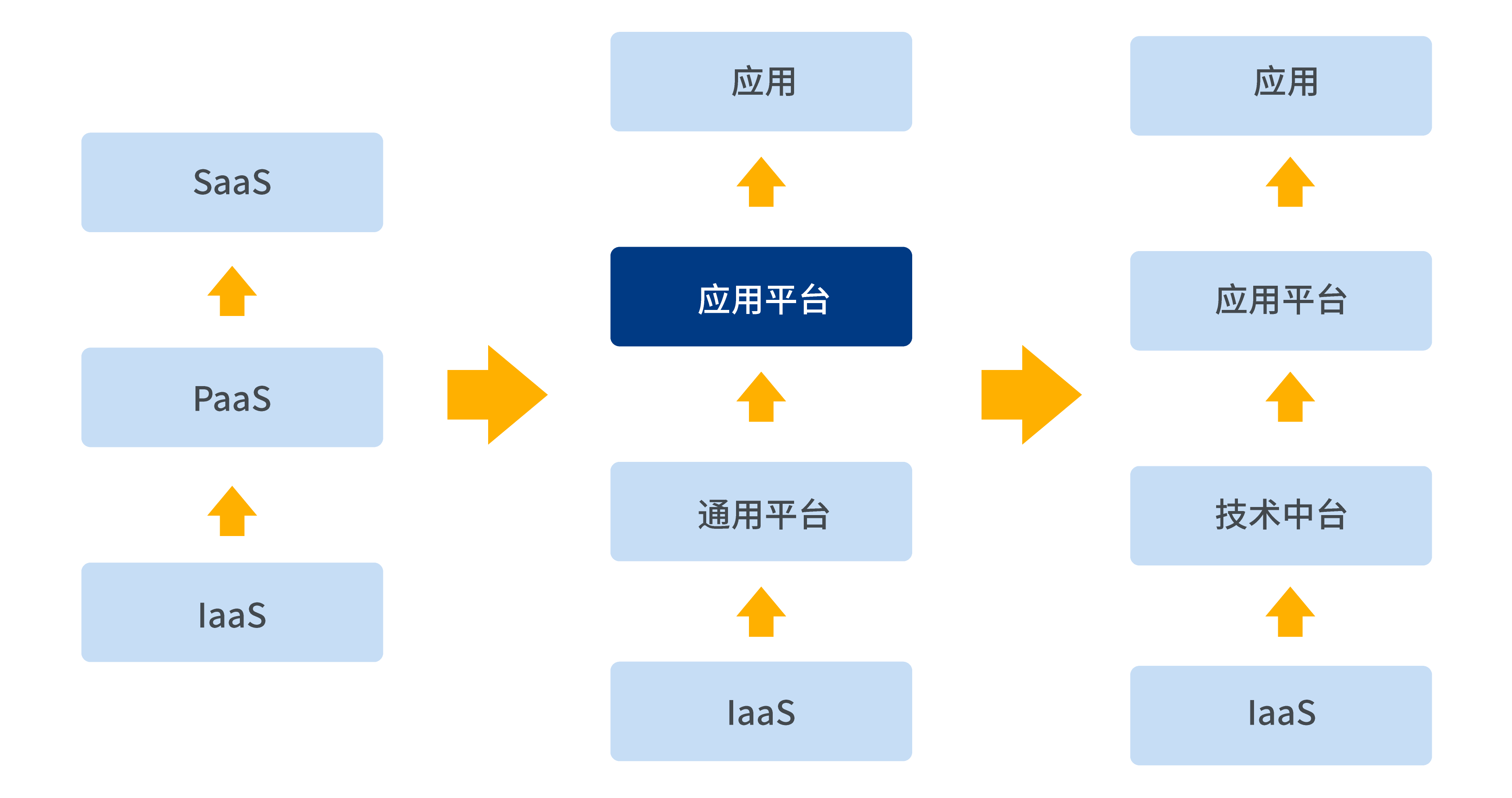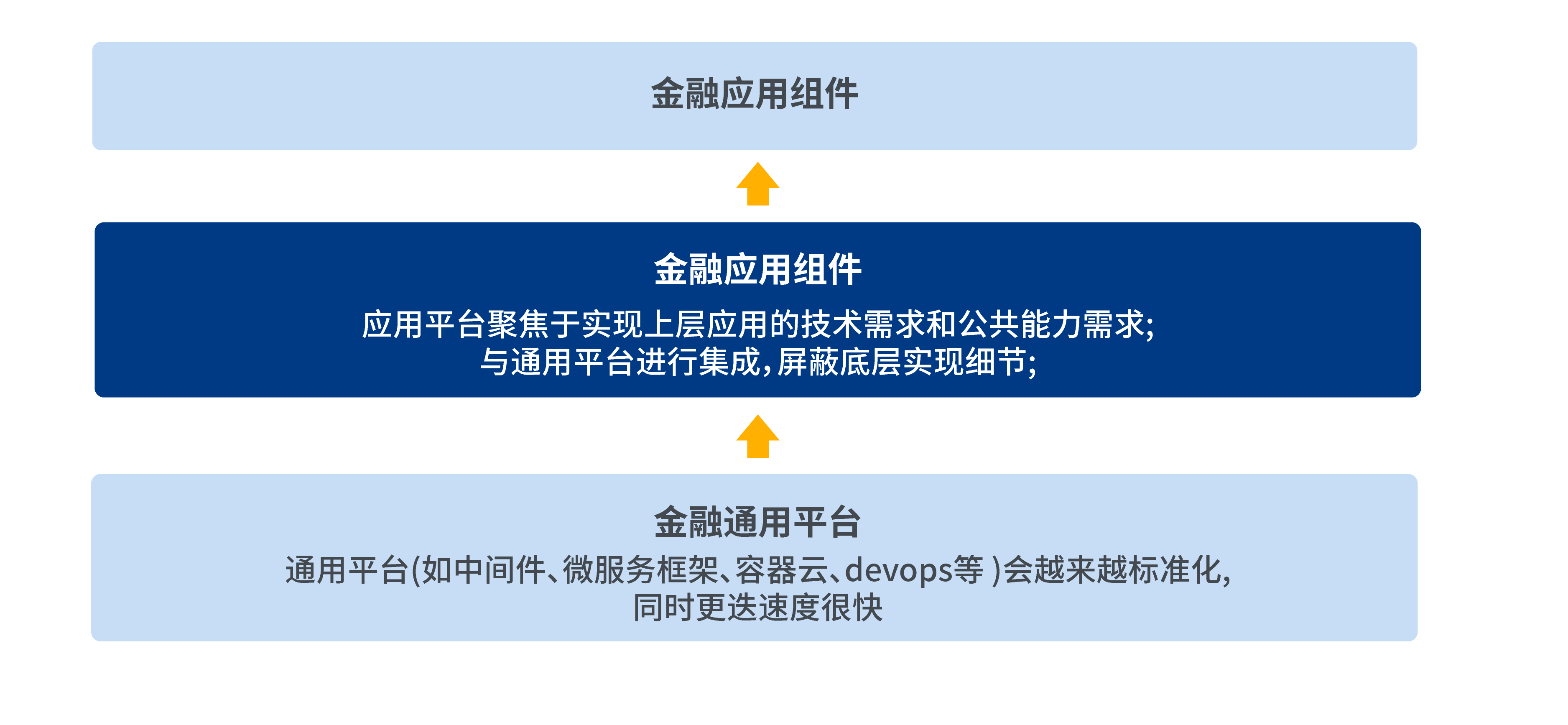 在新一代金融应用平台演进中,通用平台(包括中间件、微服务框架等通用类组件)与应用平台(面向金融应用的开发运行框架和公共能力)的分离已经成为一种趋势。因为专业性、扩展性、演变路线和解决问题域的不同,应用平台将更聚焦于应用场景业务知识的沉淀(公共能力下沉),未来也有可能逐步演变成应用中台,而通用平台更关注企业级可复用组件,或逐渐演变成技术中台。