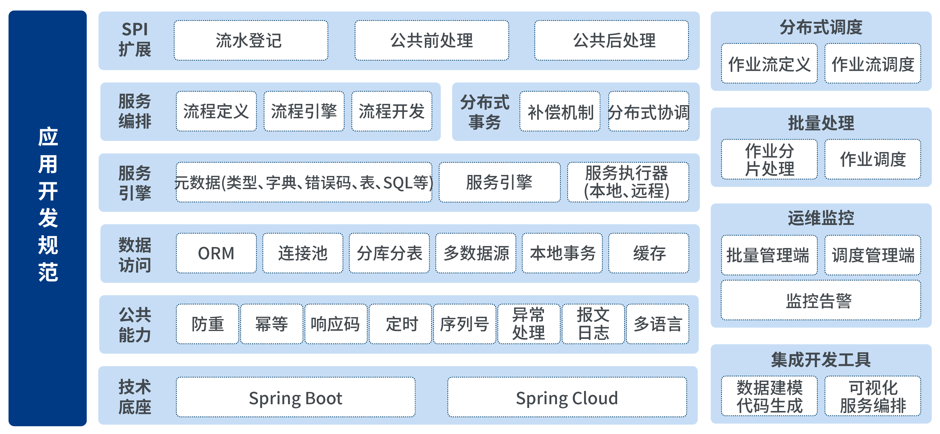 新一代金融应用平台总体架构由联机引擎(服务引擎、服务编排、分布式事务、元数据等)、批量引擎(分布式调度、批量处理)、公共能力(防重、幂等、序列号、数据访问、SPI机制、技术底座等)、开发工具和开发规范组成。