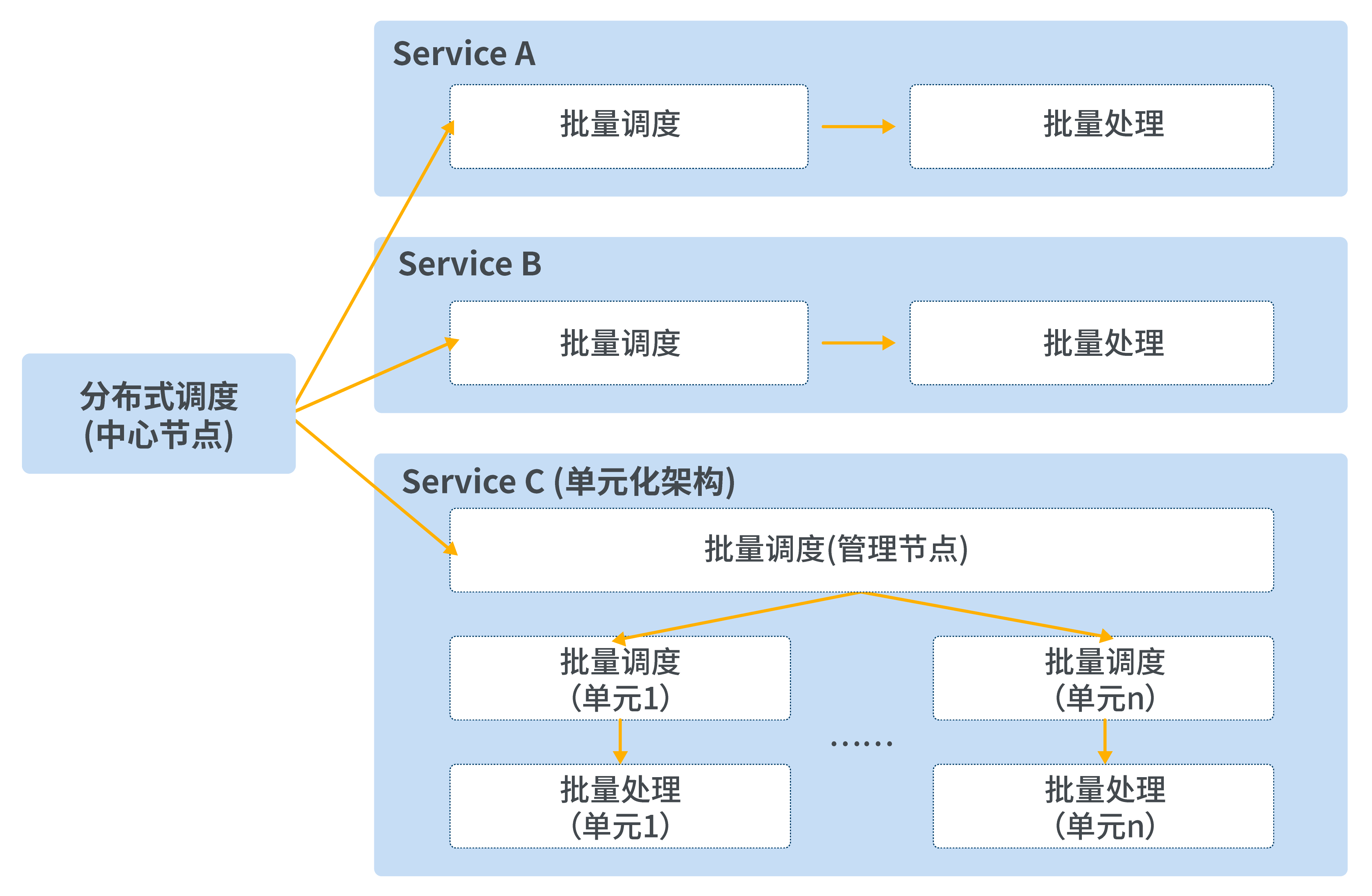 在复杂架构(微服务+单元化)下,分布式调度需要支持去中心化调度能力,以降低主节点的调度压力,将调度分散到每个微服务,每个单元处理。