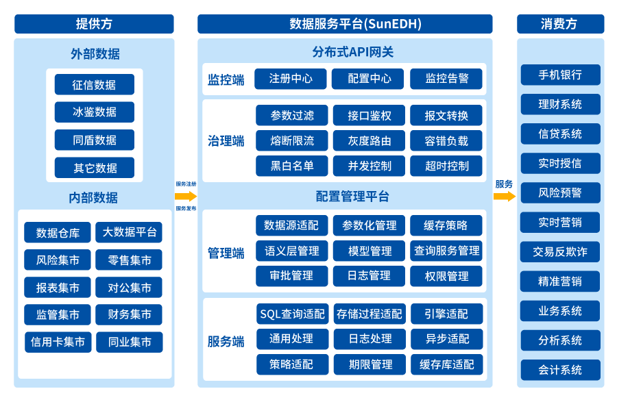 基于数据或程序等资源,根据业务场景可快速配置、快速发布服务,并对发布的服务进行编排组合,形成服务组,在线测试完成后直接发布成应用,极大地丰富了银行统一数据的服务能力。