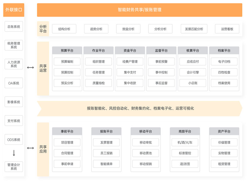 覆盖全成本财务业务流程, 包括财务预算编制、预算管控、日常费用报销、资金支付、资产管理、项目管理、合同管理、商旅平台等