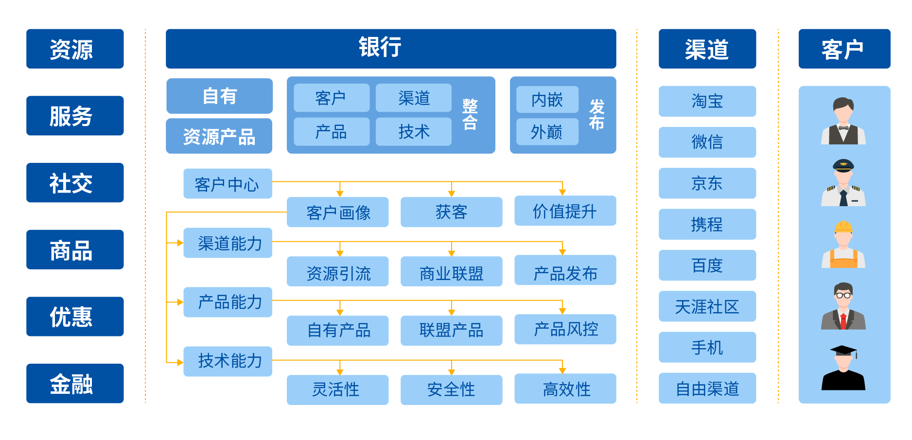 平台通过对客户体系、产品体系、渠道体系、营销体系、风控体系的层层解偶,解决了互联网金融产品、客户、渠道灵活多变的市场需求,可以配置化实现产品设计、客户分析、渠道扩展、营销及风控策略定制。