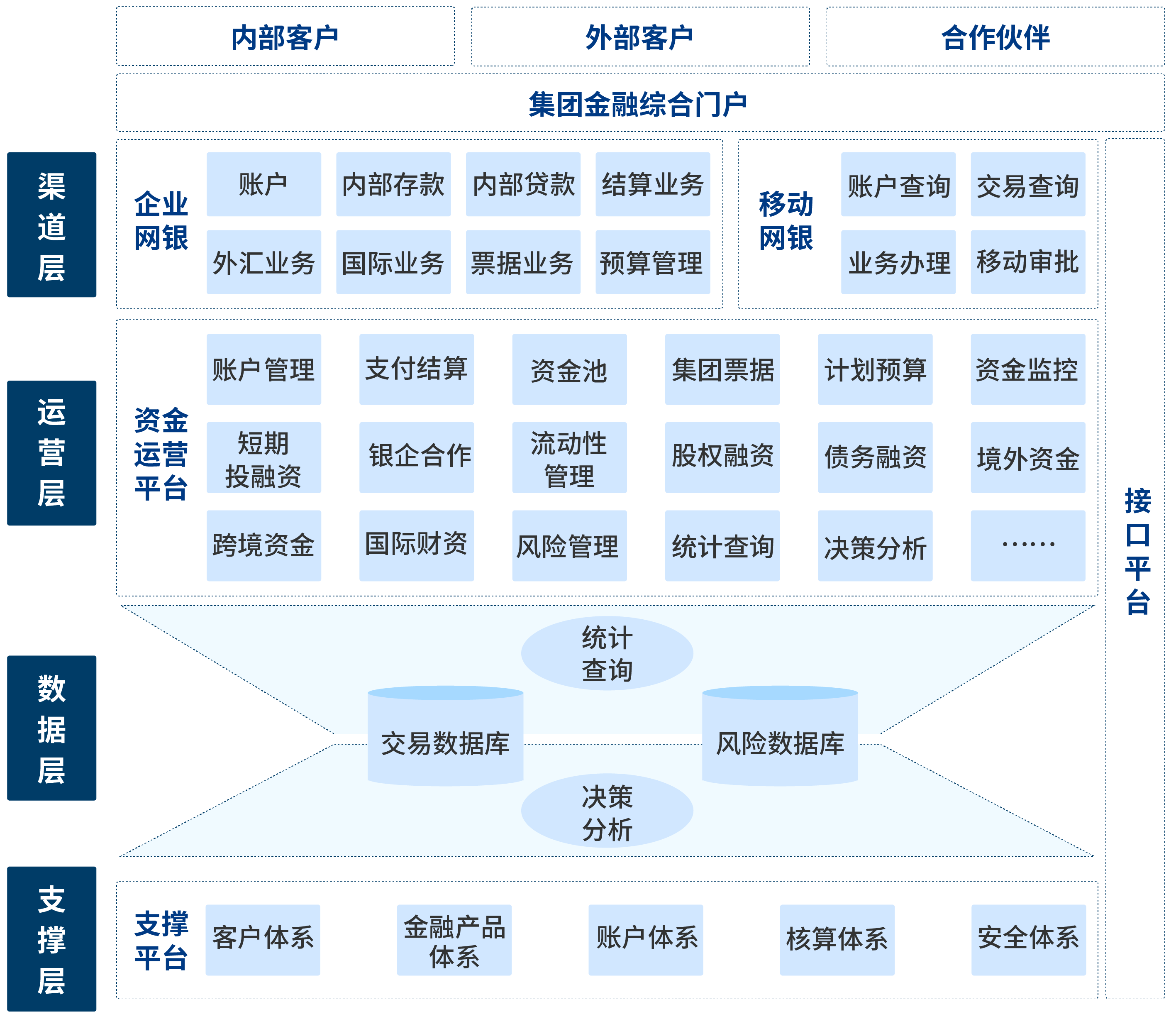 结合国内外集团资金管理行业的发展趋势,依托银行现金管理的先进经验,打造先进、安全、高效的集团资金管理系统,为大中型企业集团提全面和可靠的资金管理解决方案,主要包括账户管理、资金预算、内部存贷款、资金池管理、投融资管理、流动性管理、决策分析等功能。