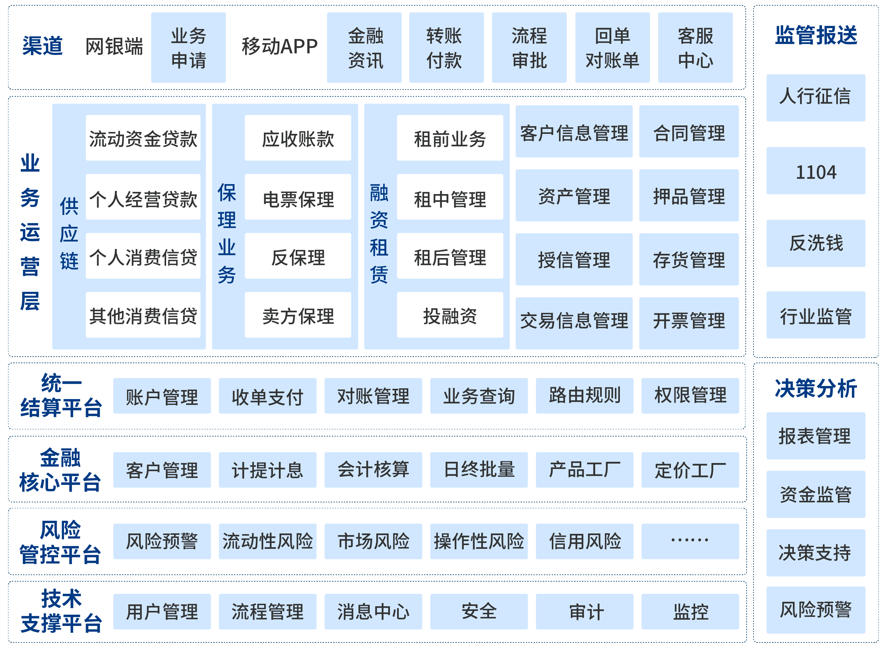 提供多元化的产品配置及业务支撑、全流程的业务闭环管理、差异化的客户金融服务