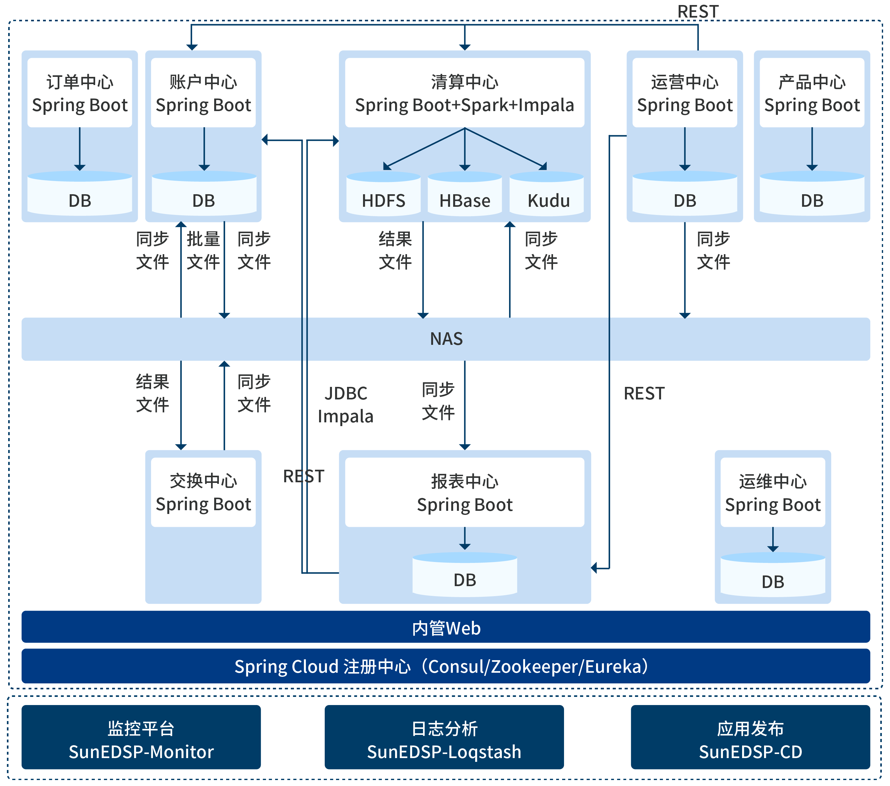 基于对接金融机构的业务场景和运营经验,采用微服务系统架构设计,通过敏捷的开发模式驱动和先进的技术体系,搭建包括清算中心、订单中心、账户中心、运营中心、交互中心、报表中心在内的一体化服务系统,提高清算系统的吞吐量、并发数和响应速度,实现流程监控简单、可控。
