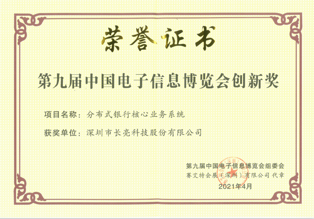 2021年4月9日,长亮科技作为金融信创代表企业出席第九届中国电子信息博览会-深圳市信创应用发展研讨会,其分布式核心系统凭借着自主创新技术及信创应用的突出成绩荣获中国电子信息博览会创新奖。