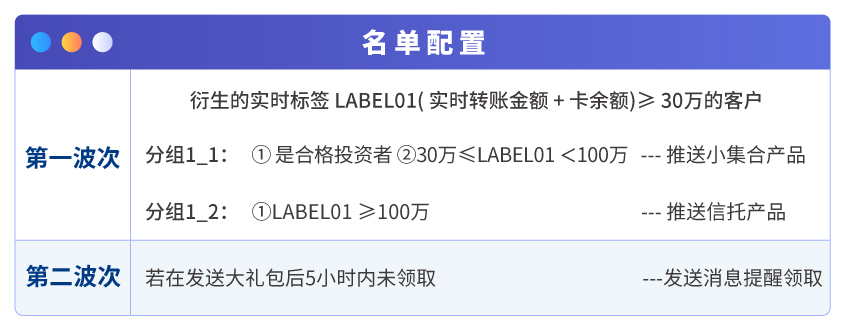 在对实时进账客户推送加息券大礼包场景中,系统通过c端客户标签多波次筛选出受众,推送不同的产品,若c端客户5小时内未领取,系统还会自动推送消息提醒,提升银行运营效率。
