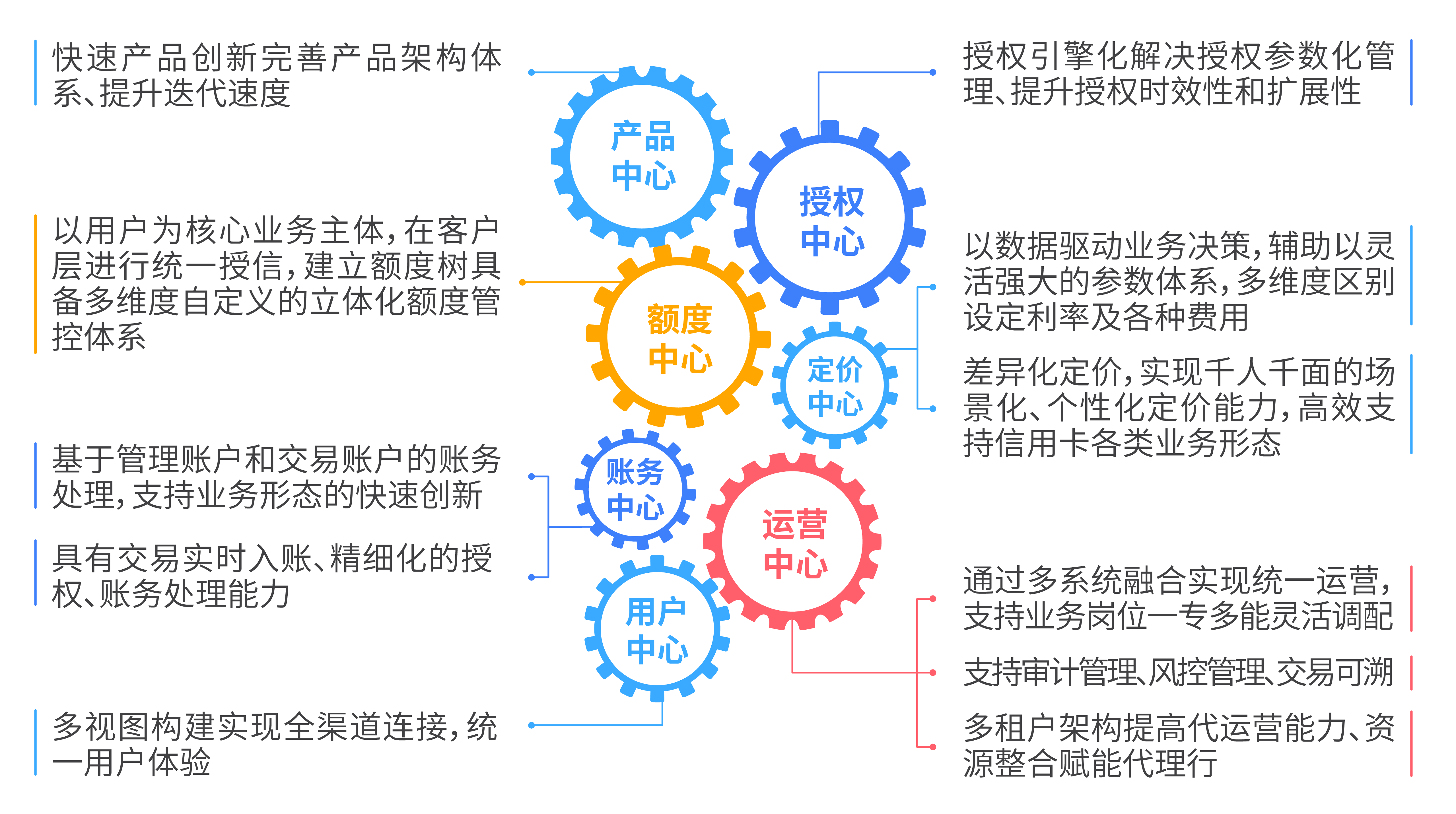 新一代信用卡核心系统基于微服务化的基本思想,建立各种彼此独立又互相协作的产品中心、定价中心、额度中心、授权中心、账务中心、运营中心、用户中心等,并以此为依托进行产品创新和业务的集中运营,从多层面有效支撑银行信用卡业务的飞速发展。