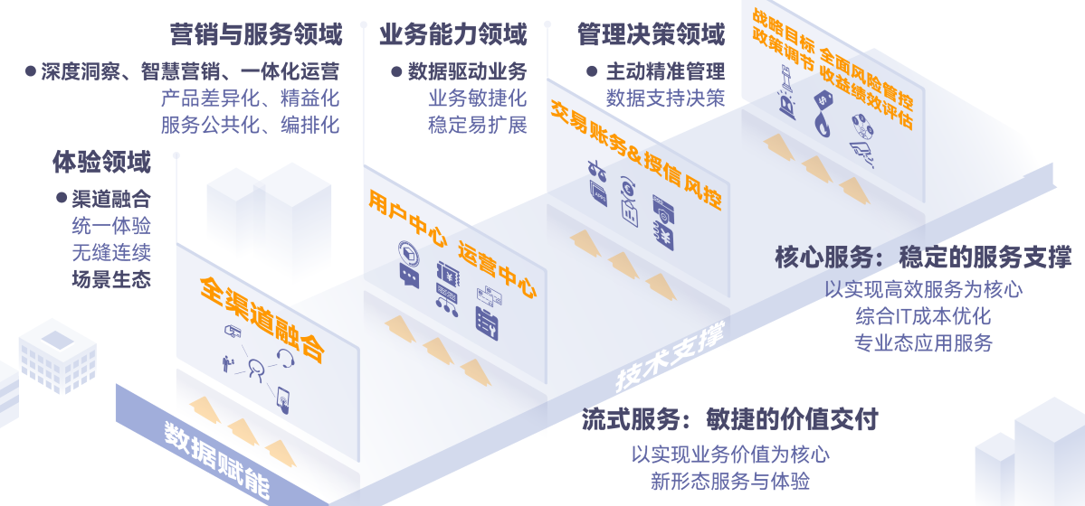 面向服务,基于业务领域而非软件系统结构提供支持;以用户为中心,提升客户洞察能力,基于用户旅程提供服务;产品定价细化到场景级,根据不同维度差异化开展营销活动,细化服务与风险管控能力;打破信息壁垒,统一产品、参数与客户视图;业务策略组件化、配置化,产品工厂能够快速发布新产品;大运营平台支持全平台运营,业务资源可弹性部署;基于数据进行业务策略的迭代演进,支持零售业态联动;所有服务7*24可用
