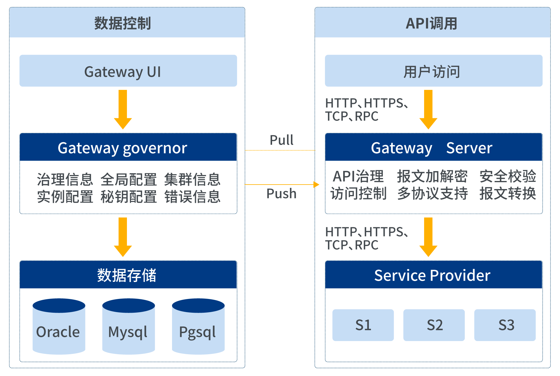 网关分为管控端(数据控制)和运行端(API调用)两个服务,且单独运行,运行端采取本地缓存存储信息不需要任何读库操作,在管控端Down机情况下,仍可以继续进行API调用。