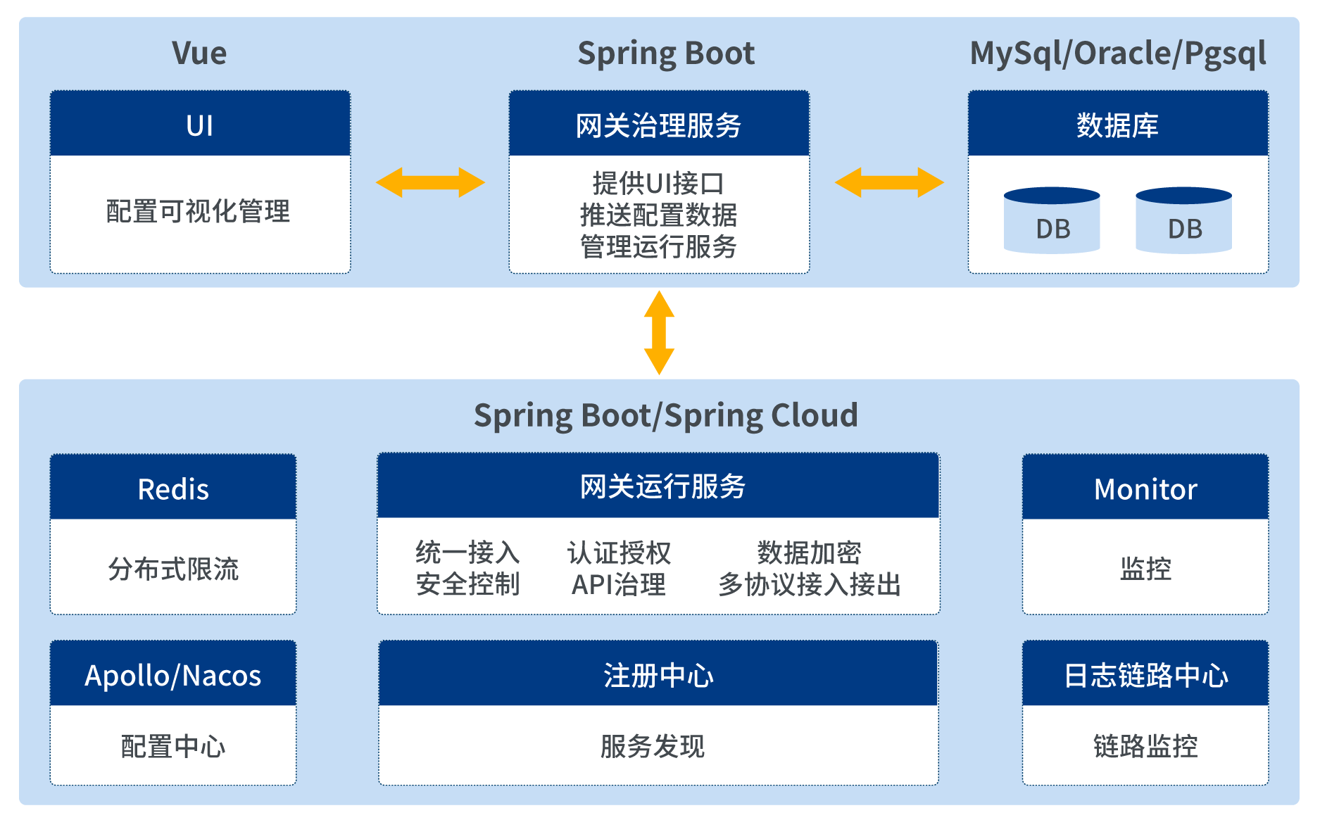 API网关采用前后端分离架构模式,以Java语言开发,选用当前主流技术栈Spring Boot,Spring Cloud体系。