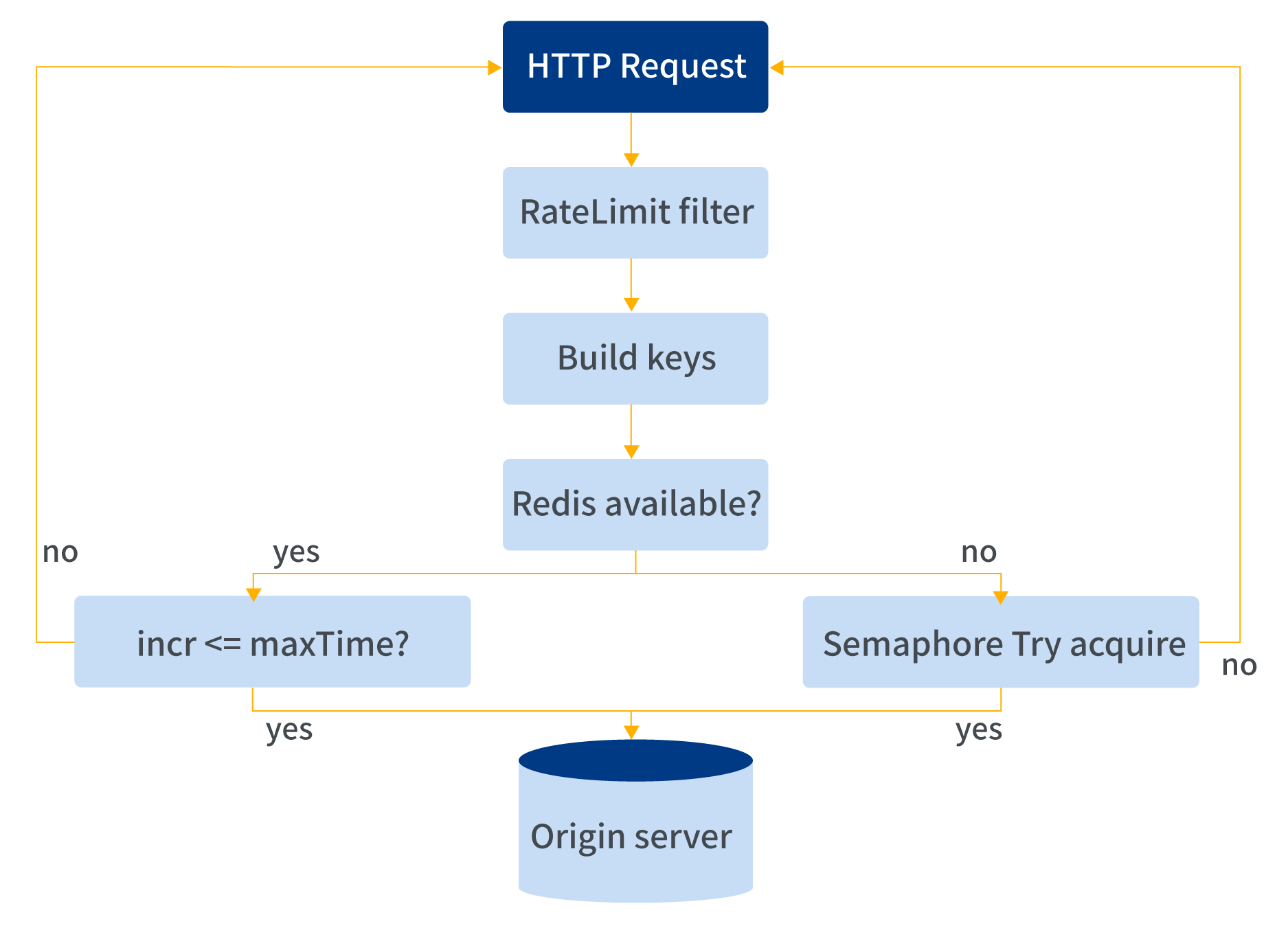 • 当Redis不可用时,则使用JVM级别的实例限流。会直接从当前实例的缓存中获取一个Semaphore信号量,并尝试获取其许可,当获取成功则表示限流通过,反之抛出限流异常。